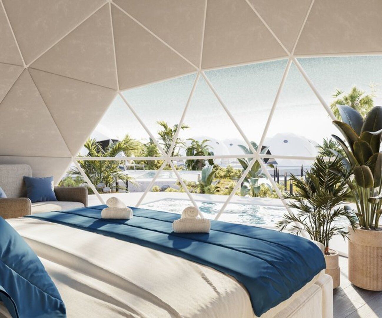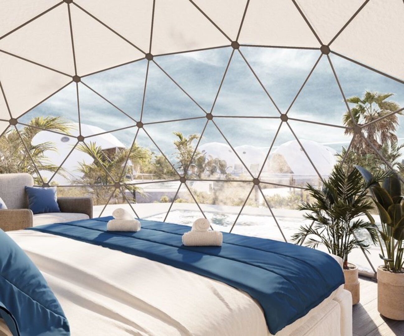 Dome private Pool: Die modernen Domes bieten jeglichen Komfort und sind mit Dusche/WC, Kosmetikspiegel, Badannehmlichkeiten, Föhn, Doppelbett (160x200 cm), individueller Klimaanlage/Heizung, Wi-Fi (inklusive), Direktwahltelefon, Mietsafe, 42" Smart-TV, Minikühlschrank, Kaffee-/Teezubehör/Wasserkocher (tägliche Auffüllung mit 4 Packungen Nescafe-Kaffee und 4 Packungen Tee pro Einheit), 2 große Flaschen Wasser à 1 Liter bei der Ankunft, großer offener Kleiderschrank, Spiegel und Verdunkelungsvorhängen ausgestattet. Die Kuppeltür verfügt über ein Moskitonetz, auf der Terrasse stehen bequeme Loungemöbel mit Tisch und Stühlen, 2 Sonnenliegen und ein Sonnenschirm zur Verfügung. Jede Unterbringung verfügt über einen eigenen Pool (D/DR). Wahlweise auch zur Alleinbenutzung buchbar (DE).