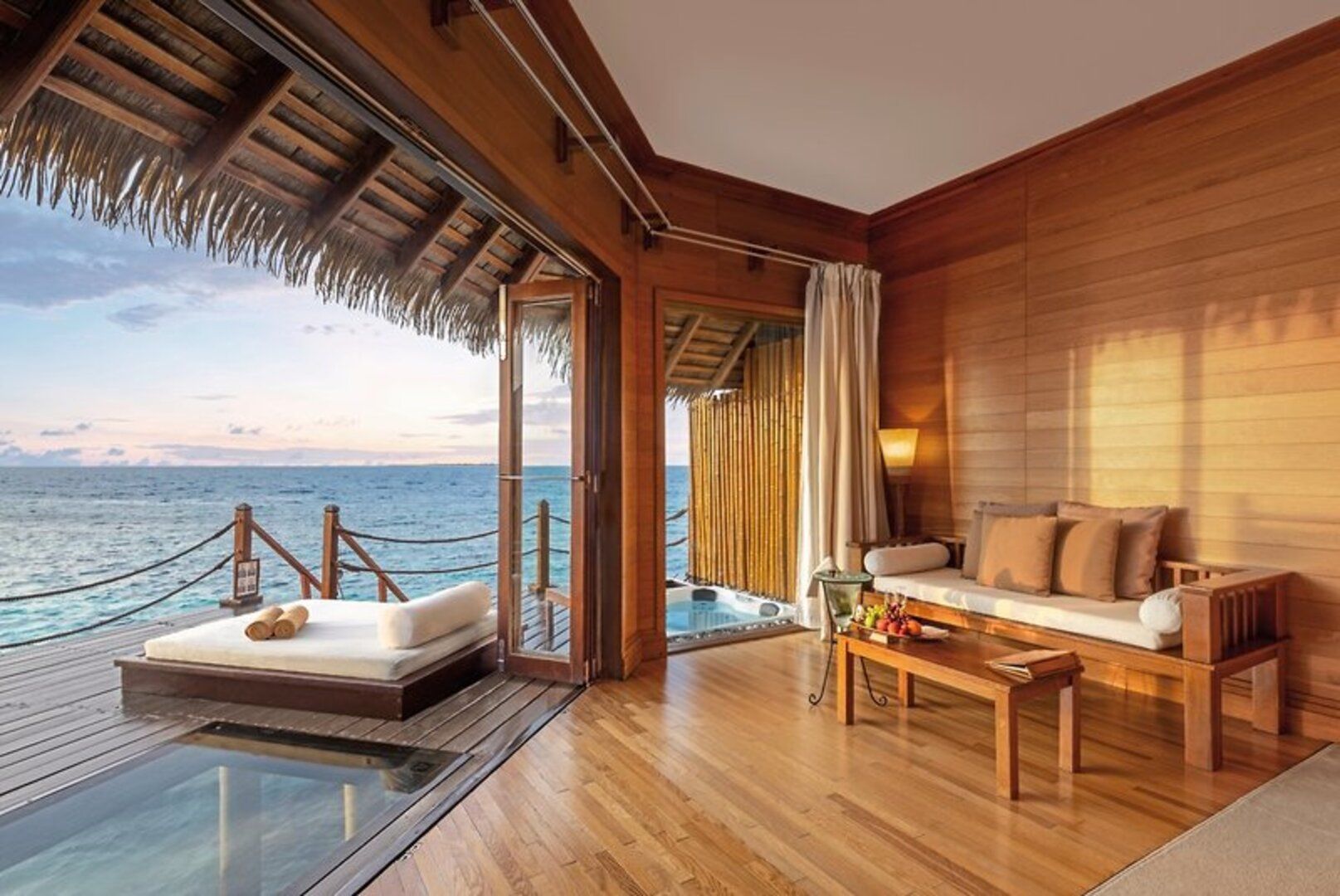 81-90 qm, Villa, in einer Doppelhaushälfte, Wasserbungalow (auf Stelzen über der Lagune), kombinierter Wohn-/Schlafraum, Dusche, WC, Bademantel, Haartrockner, Holzboden, Klimaanlage, Minibar, Auffüllung täglich, Softdrinks, Mineralwasser, Bier, Säfte, Safe, TV, Bluetooth-Lautsprecher, WLAN, Wasserkocher, Espressomaschine, Kaffee/Tee, Terrasse (möbliert), direkter Meerzugang, Whirlpool
