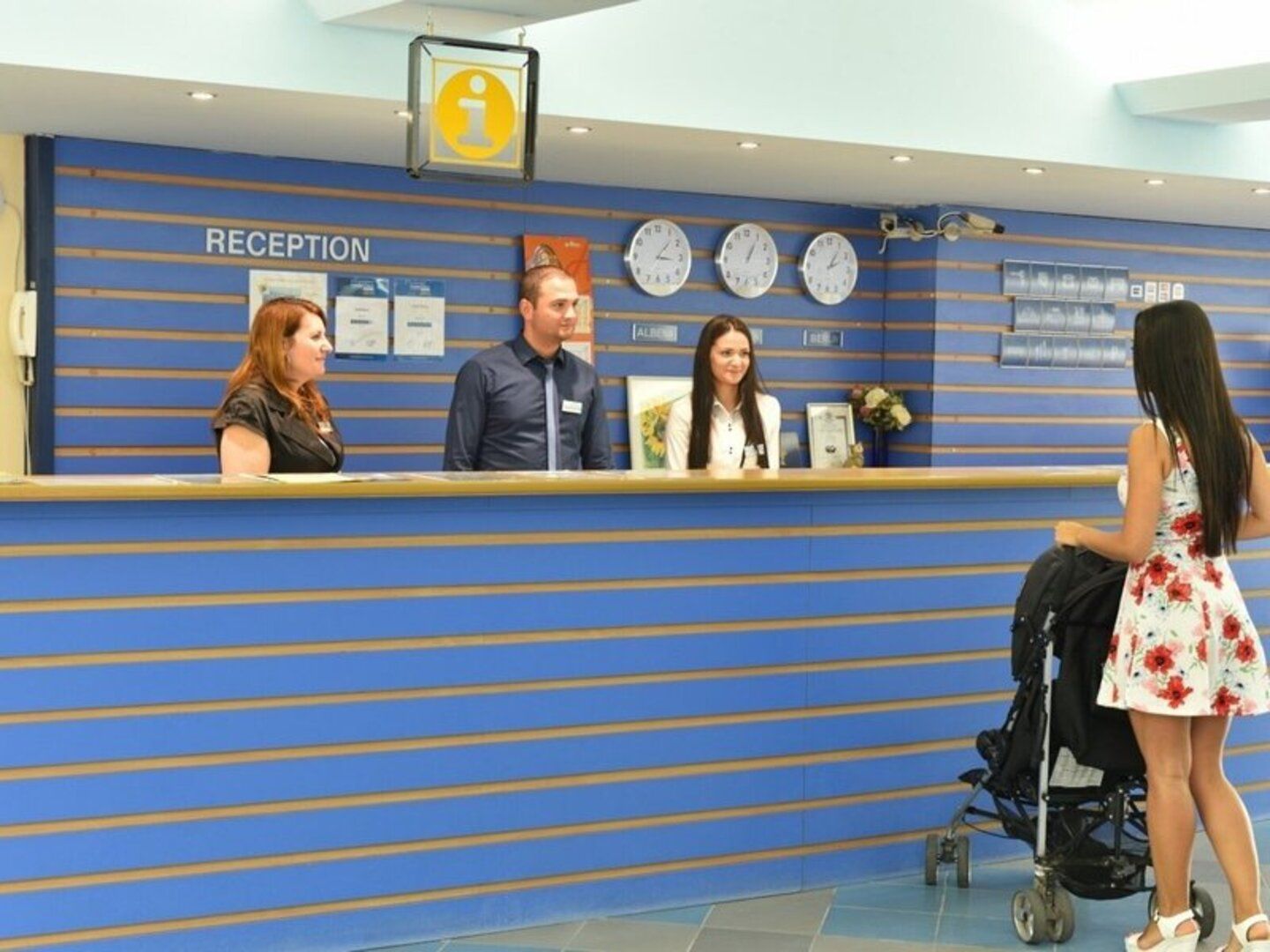 Ein Hotelkomplex mit Slavuna Beach. 2 Pools, (Indoor/Outdoor), 2 Liegen, Schirm am Pool (je nach Verfügbarkeit, Auflagen und Badetücher geg. Geb.), 2 Liegen und 1 Schirm ab 3. Strandreihe (nach Verfügbarkeit). Pool-/Snackbar, überdachte Terrasse. Empfangshalle, Rezeption, Mietsafe, WLAN (öffentlicher Bereich), Sitzgruppen, Bar, Hallenbad. Restaurant (renoviert) mit Terrasse. Landeskategorie: 4 Sterne, 186 Zimmer, 10 Etagen, Lifte.