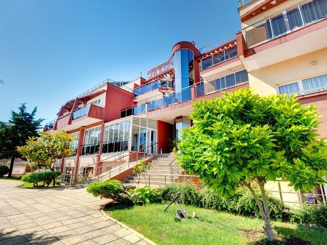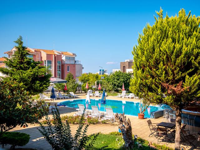 Allgemeine Beschreibung:Rund 50 m vom Sandstrand entfernt gelegenes Hotel. Zum touristischen Zentrum sind es ca. 1 km. Die Stadt Burgas ist ca. 35 km entfernt (Sozopol ca. 1 km). Ein Supermarkt ist nach ca. 1 m zu erreichen. Zu den nächsten Bars und Restaurants gelangt man nach rund 300 m. Auch die nächste Diskothek liegt rund 300 m entfernt. Folgende Sehenswürdigkeiten sind vom Hotel aus erreichbar: Sunny Beach (ca. 75 km) und Nessebar (ca. 70 km). Für Mobilität im Urlaub sorgen ein Taxistand (ca. 10 m) und eine Bushaltestelle (ca. 1 km entfernt). Weiter entfernt gelegene Orte lassen sich über den Bahnhof in rund 35 km Entfernung erreichen. Der Flughafen (BOJ) ist ca. 44 km entfernt. Ein weiterer Flughafen (VAR) liegt in etwa 168 km Entfernung. Ausstattung:Das Resorthotel verfügt über insgesamt 42 Zimmer. Es ist ausgestattet mit einer Rezeption (Check In ab 14:00 Uhr, Check out bis 12:00 Uhr), einer Lobby mit Bar, einem Lift, einer Klimaanlage, einem Safe (gegen Gebühr), einem Parkplatz (gegen Gebühr) sowie einer Geldwechsel-Möglichkeit. Für das leibliche Wohl sorgt ein Restaurant (klimatisiert). In den beiden Bars im Hotel freut man sich auf Ihren Besuch. WLAN kann von den Hotelgästen gegen Gebühr genutzt werden. Wäsche-Service ist gegen Gebühr. Schwimmbad:Zum Außenbereich des Hotels gehört ein Frischwasser-Pool mit einem separaten Kinderbecken. Hier stehen Sonnenschirme und Sonnenliegen kostenlos zur Verfügung. Eine Bar am Pool bietet den Gästen erfrischende Getränke. Verpflegung:Frühstück (von 08:00 - 10:00 Uhr) vom Buffet. Halbpension beinhaltet Frühstück und Abendessen. Vollpension Plus beinhaltet Frühstück, Mittag- und Abendessen sowie Getränke während der Mahlzeiten. Frühstück und Mittag- und Abendessen dabei nur in ausgewählten Restaurants. Sport/Freizeit:Sport- und Unterhaltungsangebote: Tischtennis (kostenlos) und Fitness. Fahrradverleih. Wellnessangebote: Sauna und Massagen gegen Gebühr. Zusätzliche Informationen:Für bestimmte Einrichtungen oder Aktivitäten können zusätzliche Gebühren anfallen. Einige Dienstleistungen hängen von der Jahreszeit und den lokalen klimatischen Bedingungen ab. Servicesprachen: englisch und deutsch. Kreditkarten: Euro/MasterCard und Visa. Standard Apartment (Balkon):Die modern eingerichteten Zimmer mit Wohnraum sind ausgestattet mit Doppelbett oder Twinbett, 1 Extrabett (Schlafsofa), gefliestem Boden, Jacuzzi, Balkon, Internet (kostenlos) und Flatscreen-Sat-TV. Handtücher werden täglich gewechselt. Luxury Zimmer (Balkon):Die modern eingerichteten Zimmer sind ausgestattet mit Doppelbett oder Twinbett, 1 Extrabett (Schlafsofa), gefliestem Boden, Balkon, Internet (kostenlos) und Flatscreen-Sat-TV. Badezimmer mit Dusche (Größe: m²). Handtücher werden täglich gewechselt. Luxury Zimmer (Meerblick, Balkon):Die modern eingerichteten Zimmer sind ausgestattet mit Doppelbett oder Twinbett, 1 Extrabett (Schlafsofa), gefliestem Boden, Balkon, Internet (kostenlos) und Flatscreen-Sat-TV. Handtücher werden täglich gewechselt. Standard Zimmer (Economy):Die komfortabel eingerichteten Zimmer Mit Doppelbett oder Twinbett, 1 Extrabett (Schlafsofa), gefliestem Boden, Balkon, Internet (kostenlos) und Flatscreen-Sat-TV. Badezimmer mit Badewanne (Größe: m²). Handtücher werden täglich gewechselt. Einzelbelegung Standard Zimmer (Balkon):Die modern eingerichteten Zimmer sind ausgestattet mit Doppelbett oder Twinbett, 1 Extrabett (Schlafsofa), gefliestem Boden, Balkon, Internet (kostenlos) und Flatscreen-Sat-TV. Badezimmer mit Badewanne (Größe: m²). Handtücher werden täglich gewechselt. Single mit Kind Standard Zimmer:Die modern eingerichteten Zimmer sind ausgestattet mit Doppelbett oder Twinbett, 1 Extrabett (Schlafsofa), Babybett (geg. Gebühr), gefliestem Boden, Balkon, Internet (kostenlos) und Flatscreen-Sat-TV sowie zentral gesteuerter Klimaanlage. Badezimmer mit Badewanne (Größe: m²). Handtücher werden täglich gewechselt. Dreifach Standard Zimmer:Die modern eingerichteten Zimmer sind ausgestattet mit Doppelbett, Twinbett oder Einzelbett, gefliestem Boden, Balkon, Internet (kostenlos) und Flatscreen-Sat-TV. Badezimmer mit Badewanne (Größe: 30 m²). Handtücher werden täglich gewechselt. Doppel Standard Zimmer:Die modern eingerichteten Zimmer sind ausgestattet mit Doppelbett oder Twinbett, 1 Extrabett (Schlafsofa), Babybett (geg. Gebühr), gefliestem Boden, Balkon, Internet (kostenlos) und Flatscreen-Sat-TV sowie zentral gesteuerter Klimaanlage. Badezimmer mit Badewanne (Größe: m²). Handtücher werden täglich gewechselt. Doppel Standard Zimmer (Meerblick):Die modern eingerichteten Zimmer sind ausgestattet mit Doppelbett oder Twinbett, 1 Extrabett (Schlafsofa), Babybett (geg. Gebühr), gefliestem Boden, Balkon, Internet (kostenlos) und Flatscreen-Sat-TV sowie zentral gesteuerter Klimaanlage. Badezimmer mit Badewanne (Größe: m²). Handtücher werden täglich gewechselt. Doppel Standard Studio (Seitlicher Meerblick):Die modern eingerichteten Zimmer sind ausgestattet mit Doppelbett, Twinbett oder Einzelbett, Babybett (geg. Gebühr), gefliestem Boden, Balkon, Internet (kostenlos) und Flatscreen-Sat-TV sowie zentral gesteuerter Klimaanlage. Handtücher werden täglich gewechselt.