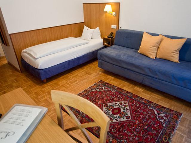 EZ: Zimmer für 1 Person mit Parkettboden, Einzelbett, Dusche/WC, Fön, TV, Telefon, Schlafcouch, Schreibtisch, Balkon.