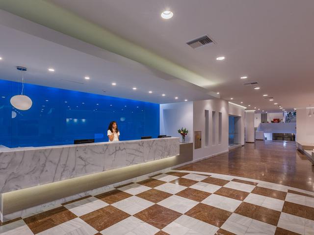 Empfangsbereich mit Rezeption, Mietsafes, Sitzgruppen, WLAN, Bar und Restaurant. Minimarkt.
