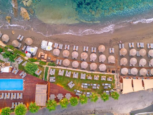 Ausstattung: Das moderne Hotel verfügt über einen Infinity-Swimmingpool, 1 weiteren Swimmingpool, Sonnenterrassen mit Liegen, Schirmen und Poolbar, Beachbar, Rooftopbar. Empfangsbereich mit Rezeption, WLAN, Bar, Buffetrestaurant und Themenrestaurant (griechische und internationale Küche). Landeskat.: 5 St., 192 Zi.