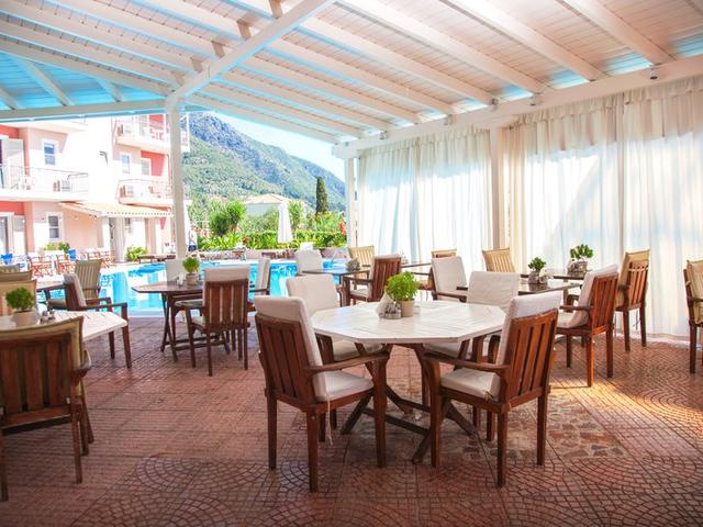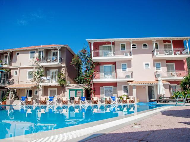 Allgemeine Beschreibung:Etwa 150 m vom Strand entfernt liegt das Hotel George Hotel. Zum touristischen Zentrum sind es nur ca. 100 m. Die Stadt Lefkas ist ca. 17 km entfernt (Aktio ca. 40 km). Einkaufen können Sie in diversen Geschäften sowie in einem Lebensmittelmarkt in ca. 200 m Entfernung. Die nächstgelegenen Bars und Restaurants erreichen Sie nach rund 150 m. Zur nächsten Diskothek gelangt man nach rund 200 m. Für Mobilität im Urlaub sorgen ein Taxistand (ca. 100 m) und eine Bushaltestelle (ca. 150 m entfernt). Zur ärztlichen Versorgung im Notfall befindet sich ein Krankenhaus in etwa 17 km Entfernung. Der Flughafen (PVK) ist ca. 36 km entfernt. Ein weiterer Flughafen (HER) liegt in etwa 0 m Entfernung. Ausstattung:Das 2-geschossige Resorthotel verfügt über 42 Zimmer, die sich auf ein Hauptgebäude und 3 Nebengebäude verteilen. Es ist ausgestattet mit einer Rezeption (Check In ab 14:00 Uhr, Check out bis 11:00 Uhr), einer Lobby, einem Safe (gegen Gebühr) sowie einem Parkplatz (gegen Gebühr). Für das leibliche Wohl sorgt ein Restaurant. Erfrischende Getränke in geselliger Runde gibt es an der Hotelbar. WLAN steht den Hotelgästen kostenlos zur Verfügung. Zimmer-Service ist kostenlos. Wäsche-/Bügel-Service ist gegen Gebühr. Schwimmbad:Zum Außenbereich des im mediterranen Stil gestalteten Hotels gehört ein Frischwasser-Pool mit einem in den Hauptpool integrierten Kinderbecken (geöffnet von Mai bis Oktober). Hier stehen Sonnenliegen und Sonnenschirme kostenlos zur Verfügung. Eine Bar am Pool bietet den Gästen erfrischende Getränke (geöffnet von 08:30 - 00:30). Verpflegung:Frühstück (von 07:30 - 10:00 Uhr) vom Buffet. Halbpension beinhaltet Abendessen. Sport/Freizeit:In ca. 150 m Entfernung vom Hotel werden Wassersportarten (teils von lokalen Anbietern) angeboten. Wellnessangebote: Massagen gegen Gebühr. Spielplatz. Zusätzliche Informationen:Für bestimmte Einrichtungen oder Aktivitäten können zusätzliche Gebühren anfallen. Einige Dienstleistungen hängen von der Jahreszeit und den lokalen klimatischen Bedingungen ab. Kein Alkoholausschank in diesem Hotel. Servicesprachen: englisch und deutsch. Kreditkarten: Diners Club, Euro/MasterCard und Visa. Standard Zimmer (Balkon oder Terrasse):Die gemütlich eingerichteten Zimmer sind ausgestattet mit Doppelbett oder Twinbett, gefliestem Boden, Wasserkocher (ggf. geg. Gebühr), Balkon, Internet (kostenlos), Safe (geg. Gebühr) und Flatscreen-TV sowie individuell regulierbarer Klimaanlage (geg. Gebühr). Handtücher werden täglich gewechselt. Größe: 19 - 21 m². Einzelbelegung Standard Zimmer:Die gemütlich eingerichteten Zimmer sind ausgestattet mit Doppelbett oder Twinbett, gefliestem Boden, Wasserkocher (ggf. geg. Gebühr), Balkon, Internet (kostenlos), Safe (geg. Gebühr) und Flatscreen-TV sowie individuell regulierbarer Klimaanlage (geg. Gebühr). Handtücher werden täglich gewechselt. Größe: 19 - 21 m².