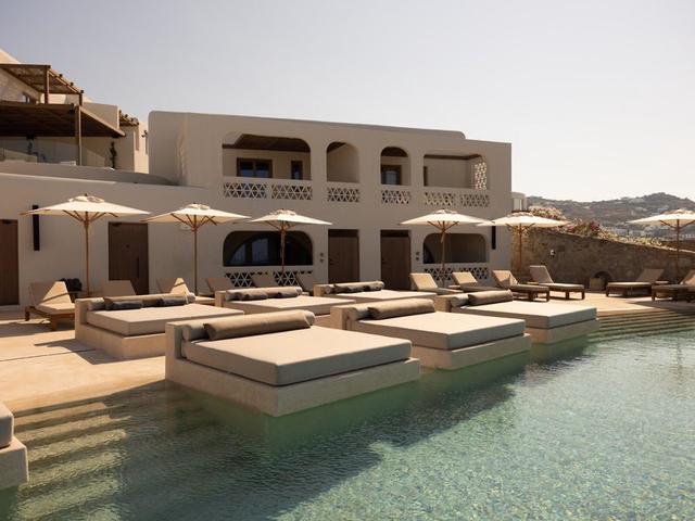 Das erwartet Sie: Luxus und mykonisches Design gehen hier eine harmonische Symbiose ein. Zwischen ruhigen Gärten, privaten Pools oder Whirlpools bieten sich atemberaubenden Ausblicke, begleitet von einer gehobene Gourmet-Küche mit neo-griechischen Meeresfrüchten und vielseitigem Sushi.