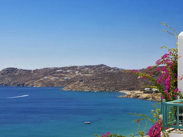 Lage & Umgebung Oberhalb des Sand-/Kiesstrandes, in Hanglage mit herlichem Panoramablick auf die tiefblaue Ägäis. Zum Strand sind es ca. 200 m über die steile Zufahrtsstraße, teilweise können auch Treppen genutzt werden. In der Saison gibt es 2 bis 3 Beach-Tavernen direkt am Strand. Mykonos-Stadt ist ca. 12 km entfernt, Ano Mera ca. 3 km, zur Linienbushaltestelle sind es etwa 300 m. Hoteleigener Shuttlebus (Häufigkeit saisonabhängig), zum Strand und nach Mykonos-Stadt.