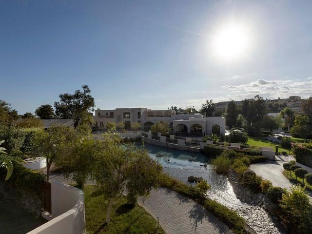 Lage & Umgebung Im unberührten Südosten der Insel, in der Bucht von Lardos, direkt am ca. 800 m langen Strand (Steine/Kiesel/Sand) gelegen. Das edle Strandresort ist eingebettet in eine spektakuläre Bergkulisse und umgeben von einem weitläufigen Gartenareal, reich an tropischen und inseltypischen Blumen und Bäumen, die sich um einen künstlich angelegten Bach gruppieren. Im Inneren dominieren helle Töne, modernes Ambiente harmoniert mit schlichter Eleganz.