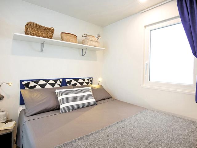 Wohnen: Mobilehomes (MH7, ca. 29 qm), Happy Premium, Wohn-/Schlafraum mit Schlafbank, 3 sep. Schlafzimmer (1x Doppelbett, 2x mit je 2 Einzelbetten), Küchenzeile. Dusche, WC. Halb überdachte Holzveranda mit Gartenmöbeln, kleiner Elektrogrill. Max. 7E