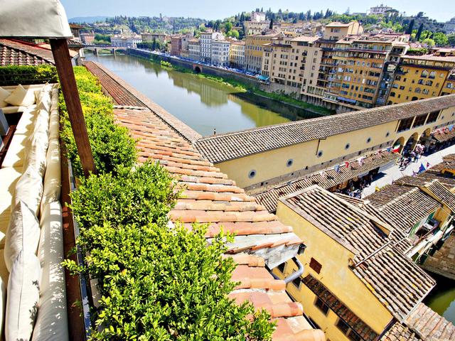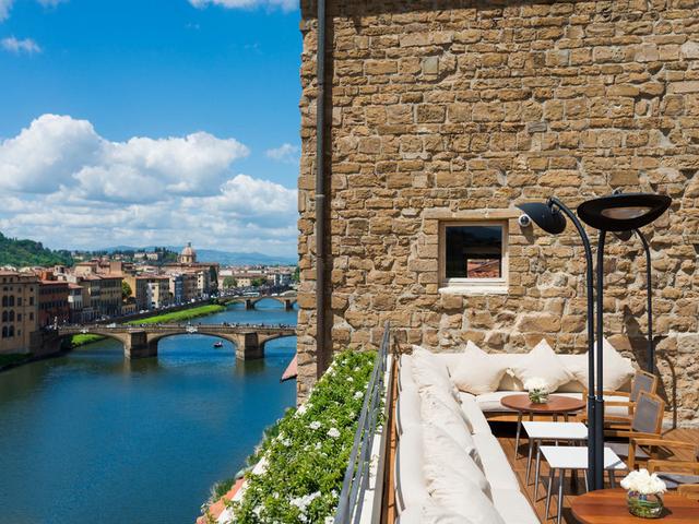 Das erwartet Sie: Charmantes Hotel mit einem historischen Turm aus dem 13. Jahrhundert und Panoramadachterrasse mit Blick auf die Ponte Vecchio und die Dächer der Stadt. Ganz in der Nähe: die angesagte Via Tornabuoni.