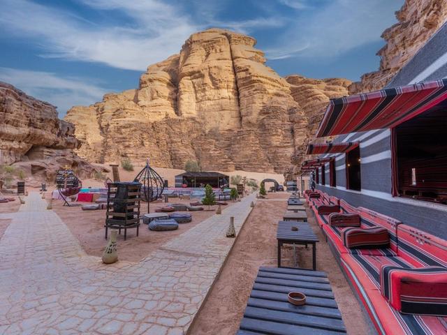 Lage & Umgebung Tauchen Sie ein in die Magie der jordanischen Wadi-Rum-Wüste. Diese Unterkunft befindet sich in geschützter Lage am Fuß eines Sandsteinfelsens. In unmittelbarer Umgebung gibt es einige Felszeichnungen und in Stein gemeißelte Statuen zu entdecken. Der Flughafen Aqaba liegt ca. 78 km entfernt.