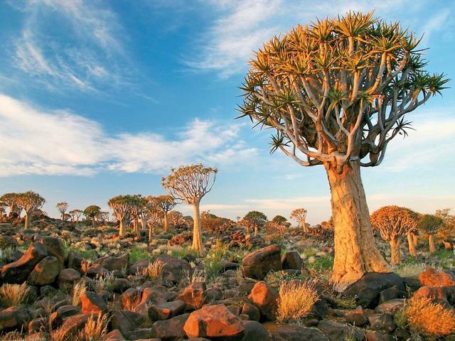 2. Tag: Kalahari - Fish River Canyon (Mittwoch) Heute fahren Sie weiter in Richtung Süden und besichtigen den Garas Köcherbaumwald in der Nähe von Keetmanshoop. Die ausgehölten Äste dieser Aloe wurden früher von den Buschmännern als Köcher benutzt, daher stammt auch der Name der Pflanze. Vorbei an Bergen, Geröllfeldern und karg bewachsenen Steppen gelangen Sie in die Nähe des Fish River Canyons zu Ihrer Unterkunft. Am späten Nachmittag können Sie optional eine geführte Wanderung unternehmen oder an einer Naturrundfahrt teilnehmen und anschließend einen herrlichen Cocktail bei Sonnenuntergang genießen (fakultativ). Eine Nacht im Canyon Village (Mittelklasse). Ca. 450 km (Frühstück)