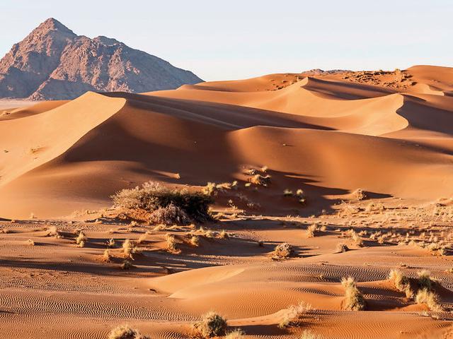 5. Tag: Sossusvlei/Sesriem Canyon (Samstag) Heute heißt es früh aufstehen! Eine Tasse Tee oder Kaffee in der Dämmerung und vor Sonnenaufgang fahren Sie in das Herz der Namib Wüste, um die höchsten Dünen der Welt zu erleben. Die riesigen, ockerfarbenen Sanddünen bieten ein unvergessliches Panorama! Der Ausblick vom Herz der Namib auf das rotschimmernde Dünenmeer im Licht der frühen Sonnenstrahlen ist unvergesslich. Selbst Morgenmuffel sind da einfach nur glücklich. Hier beim Sossusvlei, wo das Wasser vom Tsauchab-Fluss alle paar Jahre in einer guten Regenzeit zwischen den mächtigen Sanddünen versickert, schenkt Ihnen die Natur grandiose Anblicke: Die weißen, meist ausgetrockneten Lehmpfannen (vleis) leuchten mit den roten Dünen und dem tiefblauen Himmel um die Wette. Verwitterte Bäume sorgen im Deadvlei für die nötigen Kontraste und die knorrigen Kameldornbäume, die wundersamerweise genug Wasser im Grundwasser zum Überleben finden, spenden Schatten und Lebensraum für Tiere und Pflanzen vor der Hitze. Wassertrinken ist Pflichtprogramm – aber das merken Sie schnell selbst! Nachdem es mit Ihrem Reiseleiter erst im Sand hoch hinauf ging, steigen Sie im Anschluss Felsen hinab. Der Sesriem Canyon, der vor Millionen von Jahren vom Tsauchab Fluss in den Boden eingegraben wurde, ist rund einen Kilometer lang und eine stellenweise 30 m tiefe und schmale Schlucht. Wer den Canyon nicht kennt, würde ihn in der Ebene glatt übersehen. Frühe Siedler mussten sechs (ses) Lederriemen (rieme) aneinanderbinden, um an das Wasser unten zu kommen. Ca. 210 km (Frühstück)