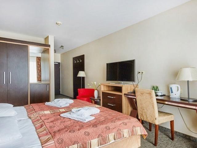 Hotelausstattung: Rezeption mit Safe, Restaurant, Speisesaal, Café, Bar, Kamin, Lift, W-LAN, Hallenbad, Whirlpool, Fitnessraum, Sauna, Salzgrotte. Gegen Gebühr: Leihbademantel, Tiefgarage.