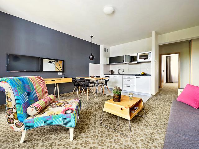 Wohnen: Doppelzimmer (DZ, ca. 29 qm), Sofabett (1,40 m, statt Bett), TV, Küchenecke, Bad oder Dusche, WC, Föhn