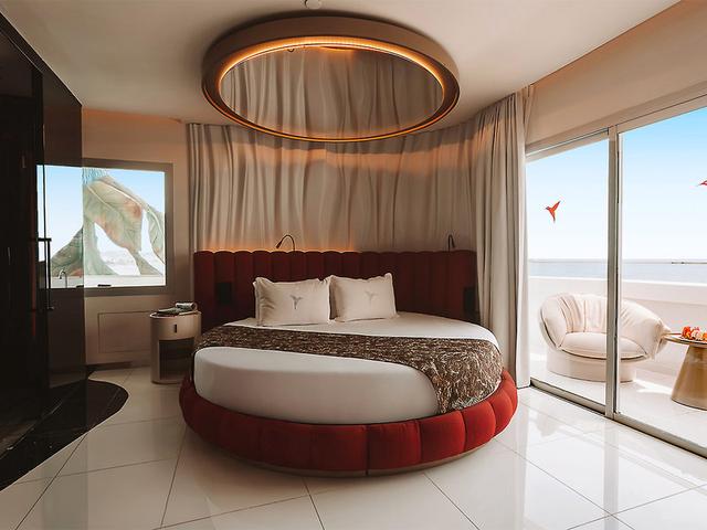 Doppelzimmer Premium "Fashion Victim" (DZF, ca. 42 qm), rundes Bett, Klimaanlage, Telefon, WLAN (inklusive), TV, Safe, Maxibar (gegen Gebühr), Kaffeemaschine, Theke, Weinklimaschrank. Badezimmer mit frei stehender Dusche, WC, Föhn, Bademäntel, Balkon, Whirlpool. Max. 2E