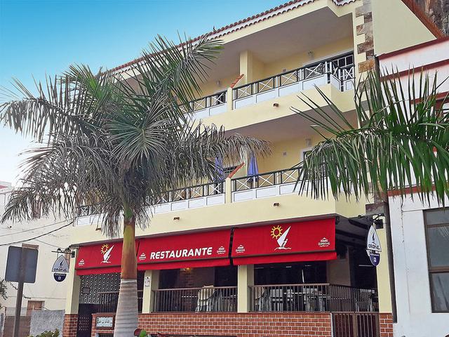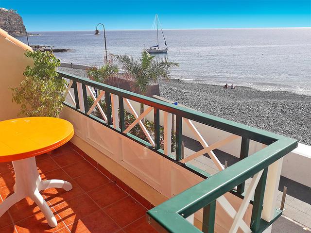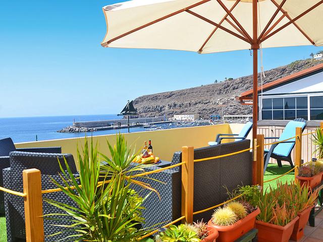 Lage: Im sonnigen Südosten, in Playa Santiago mit Blick auf den kleinen Hafen, durch die Uferstraße vom dunklen Lavastrand (Kiesel/Sand) getrennt.
