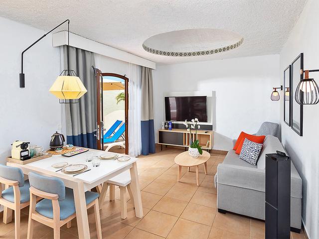 Bungalowsuite-Premier (SU/SUA, ca. 45 qm, Emblem), Klimaanlage, Wohnraum mit Schlafsofa, Kitchenette, sep. Schlafzimmer, TV, Mietsafe, WLAN, Telefon. Bad mit Dusche/WC, Föhn. Terrasse mit Gartenblick, zur Alleinnutzung (SUE) buchbar. Max. 3E+1K/2E+2K