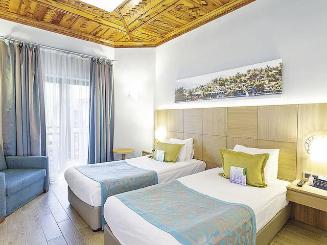 Lage: Ruhig auf einer Halbinsel in der Bucht von Fethiye, direkt an 3 hoteleigenen, flach abfallenden Stränden (Sand, mit Kies durchsetzt). Bis ins Zentrum von Fethiye mit einigen Einkaufs- und Unterhaltungsmöglichkeiten sind es ca. 4 km.