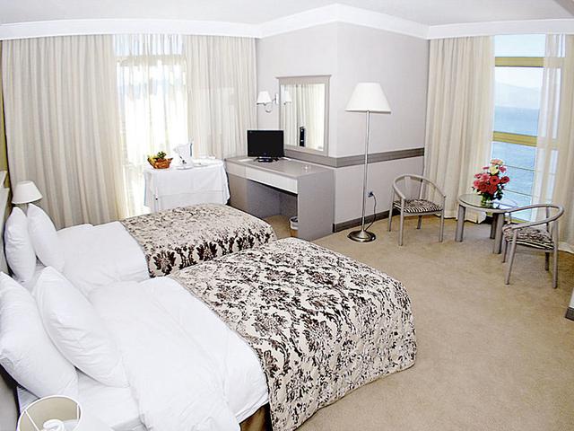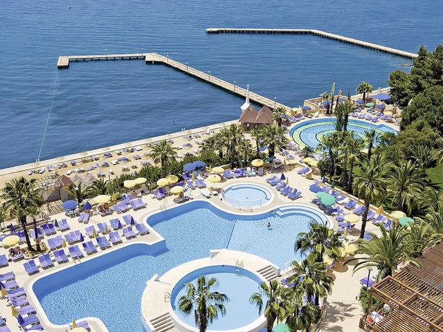 Ausstattung: Hotel der Luxusklasse. 2 Swimmingpools (Hallenbad saisonal beheizbar), Sonnenterrassen. Liegen, Schirme, Badetücher an Pool/Strand. Pool-/Snackbar. Rezeption, WLAN (in der Lobby), Bars, Restaurant mit Terrasse und Meerblick, 2 À-la-carte-Restaurants (ca. 01.06.-30.09.), Geschäfte, Minimarkt, Miniclub, Friseur, Wellnessbereich (ca. 900 qm). Landeskat.: 5 Sterne, 333 Zimmer, 8 Etg., 4 Lifte.