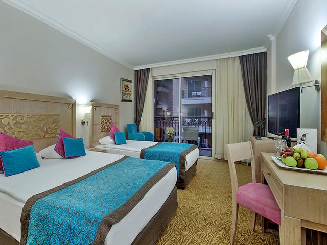 Ausstattung: Hotel der gehobenen Mittelklasse, bestehend aus 5 Gebäuden und einem großen Außenbereich. Swimmingpool, sep. Aquapark (stdw.), Sonnenterrassen, Poolbar. Liegen, Auflagen, Schirme (Badetücher geg. Kaution). Empfangshalle, Rezeption, WLAN. Hauptrestaurant, 4 À-la-carte-Restaurants (italienisch, türkisch, mexikanisch, mediterran (Fisch); teilweise gegen Gebühr, Reservierung), Bars, Diskothek, Geschäfte. Landeskat.: 5 Sterne, 380 Zimmer, 5 Etagen, Lifte.