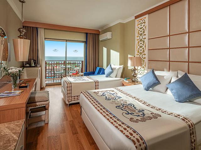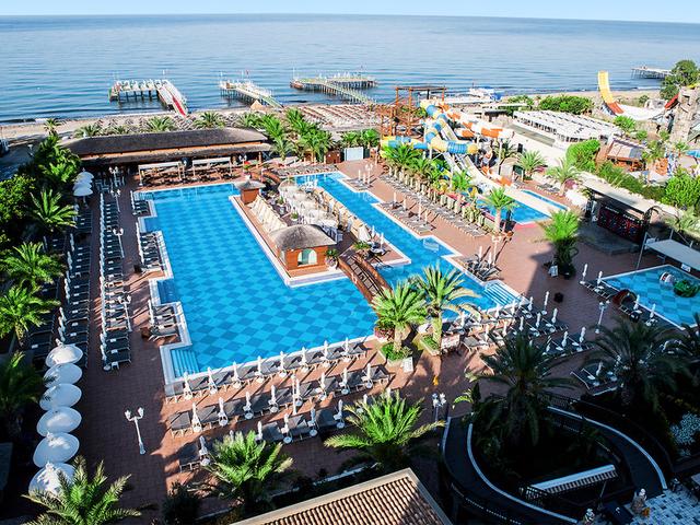 Lage: Direkt am breiten Strand mit hoteleigenem Badesteg (Sand/Kies; vorgelagerte, flache Felsplatten). Das Zentrum von Alanya ist ca. 12 km entfernt.