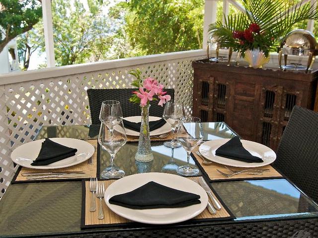 Eingebettet in Gärten aus Palmen, Bambus und Bougainvillea liegen die Suiten in der Nähe der Anhöhe des historischen Fort George. Der Strand sowie einige Pubs und Restaurants sind in wenigen Gehminuten zu erreichen. Einkaufsmöglichkeiten finden sich im ca. 10 km entfernten Stadtzentrum von Scarborough. Touristische Attraktionen wie das Buccoo-Riff oder die Argylle-Wasserfälle erreichen Sie nach ca. 17 km bzw. ca. 10 km und ein Wald liegt in rund 30 km Entfernung. Bis nach Charlotteville sind es ca. 35 km. Das klimatisierte Gebäude verfügt über Empfangshalle, Hotelsafe, Wechselstube und Bar. Im Bar-Restaurant La Belle Creole erwarten Sie traditionelle Gastfreundschaft und das Ambiente der südlichen Karibik. Entspannen Sie sich in den riesigen Korbsesseln und plaudern Sie ein wenig, während Ihr Essen zubereitet wird. Sie können auch den Zimmer- und den Wäscheservice, den Internetzugang sowie den Parkplatz nutzen. Die wunderschönen, im Kolonialstil eingerichteten Suiten haben ein Dachfenster mit spektakulärer Sicht auf die halbmondförmige Bucht von Bacolet und den Pool - eine Kulisse, die für ruhige, romantische Tage und exotische Nächte sorgt. Eine Tür öffnet sich zu der mit Rattanmöbeln bestückten Veranda. Alle Suiten sind klimatisiert und verfügen über Bad/Dusche, Haartrockner, Direktwahltelefon, Sat./Kabel-TV, Radio, HiFi-Anlage und Internet. Darüber hinaus gehören Annehmlichkeiten wie Kühlschrank, Tee-/Kaffeezubereiter und Mietsafe zur Ausstattung. Die Fenster verfügen über Fensterläden. In der Außenanlage gibt es einen bis Mitternacht geöffneten Pool und eine Sonnenterrasse mit Liegestühlen und Sonnenschirmen.orgens wird ein Frühstück geboten. Sowohl Mittag- als auch Abendessen können à la carte oder als Menü gewählt werden, zudem werden spezielle Gerichte geboten. Bed & Breakfast oder Halbpension sind buchbar.