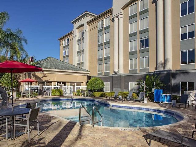 Allgemeine Beschreibung:Das Resorthotel Hampton Inn Orlando/Lake Buena Vista befindet sich rund 9,7 km von der Sehenswürdigkeit Animal Kingdom entfernt. Folgende Sehenswürdigkeiten sind vom Hotel aus erreichbar: Animal Kingdom (ca. 9,7 km), Aquatica, Blizzard Beach, Bob Carr Performing Arts Ctr und Church Street Station. Der Flughafen (MLB) ist in unmittelbarer Nähe zu finden. Ein weiterer Flughafen (SFB) liegt in etwa 74 km Entfernung. Ausstattung:Das Hotel ist ausgestattet mit einer Rezeption (Check In ab 15:00 Uhr, Check out bis 11:00 Uhr) sowie einer Lobby. Für den Zimmer-Service und Concierge-Service fallen ggfls. Gebühren an. Schwimmbad:Zum Außenbereich des Hotels gehört ein Pool. Sport/Freizeit:Sport- und Unterhaltungsangebote: Fitness. Zusätzliche Informationen:Für bestimmte Einrichtungen oder Aktivitäten können zusätzliche Gebühren anfallen. Einige Dienstleistungen hängen von der Jahreszeit und den lokalen klimatischen Bedingungen ab. Servicesprachen: englisch. Kreditkarten: Euro/MasterCard, Visa und American Express. King Zimmer (Eingeschränkte Mobilität):Mit Wasserkocher (ggf. geg. Gebühr) und Internet (ggf. geg. Gebühr) sowie zentral gesteuerter Klimaanlage. Badezimmer mit Badewanne und Dusche. King Zimmer (TypeC Eingeschränkte Mobilität):Mit Wasserkocher (ggf. geg. Gebühr) und Internet (ggf. geg. Gebühr) sowie zentral gesteuerter Klimaanlage. Badezimmer mit Badewanne und Dusche. King Zimmer (Mit Schlafsofa):Mit Wasserkocher (ggf. geg. Gebühr) und Internet (ggf. geg. Gebühr) sowie zentral gesteuerter Klimaanlage. Badezimmer mit Badewanne und Dusche. 2 Queen Beds Zimmer:Mit Wasserkocher (ggf. geg. Gebühr) und Internet (ggf. geg. Gebühr) sowie zentral gesteuerter Klimaanlage. Badezimmer mit Badewanne und Dusche. 2 Queen Beds Zimmer (Eingeschränkte Mobilität):Mit Wasserkocher (ggf. geg. Gebühr) und Internet (ggf. geg. Gebühr) sowie zentral gesteuerter Klimaanlage. Badezimmer mit Badewanne und Dusche. 2 Queen Beds Zimmer (Type B):Mit Wasserkocher (ggf. geg. Gebühr) und Internet (ggf. geg. Gebühr) sowie zentral gesteuerter Klimaanlage. Badezimmer mit Badewanne und Dusche.
