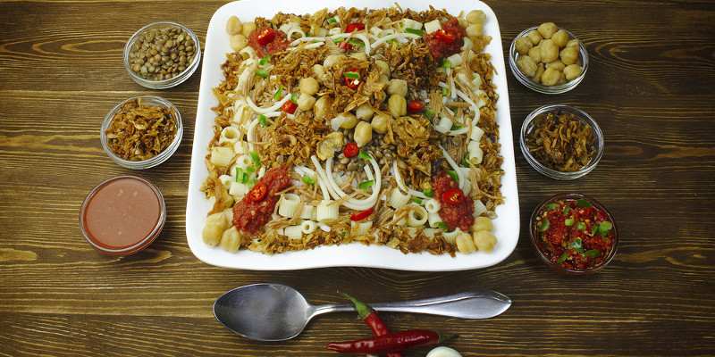 - Koshery: Ein günstiges und nahrhaftes Essen. Kleine spezielle Nudeln und Kichererbsen werden gemischt, mit Tomatensoße übergossen und einer Hand voll Röstzwiebeln garniert. Selber kann man dann das Gericht noch mit Knoblauch und scharfer Soße individuell nachwürzen! Dazu wird eingelegtes Sauergemüse serviert.