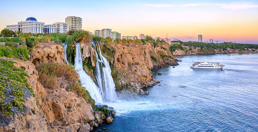 Die Megametropole Antalya ist auch in Sachen Natur nicht zu unterschätzen. Inmitten von grünen Parks, vor rauschenden Wasserfällen und in geheimnisvollen Höhlen könnt ihr all die Eindrücke der geschäftigen Stadt verarbeiten. Nur wenige Minuten von der Altstadt entfernt bietet der rund 140.000 m² große Karaaolioglu-Park ein Fest für alle Sinne. Lasst den Blick über das blaue Meer und die Sehenswürdigkeiten Antalyas schweifen, lauscht dem Zwitschern der Vögel und atmet die salzige Meeresluft ein, während die Kinder zwischen den Hecken und Bäumen umhertollen.