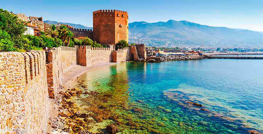 Im Westen der Türkei streckt sich euch die hügelige Felsspitze Alanyas entgegen. Der Weg dorthin führt meist über Antalya. Von dort aus erreicht ihr innerhalb von rund zwei Stunden mit dem Shuttle oder öffentlichen Bussen Alanya. Von ein paar deutschen Städten gelangt ihr auch zum kleinen Flughafen Alanya-Gazipasa, der rund 40 Kilometer vom Stadtzentrum entfernt ist. Seid ihr nach einer etwa einstündigen Busfahrt angekommen, ist der Strand nicht weit – ganz egal, ob ihr euch für ein Resort direkt am Meer oder für ein kleineres Hotel in der Innenstadt entscheidet.