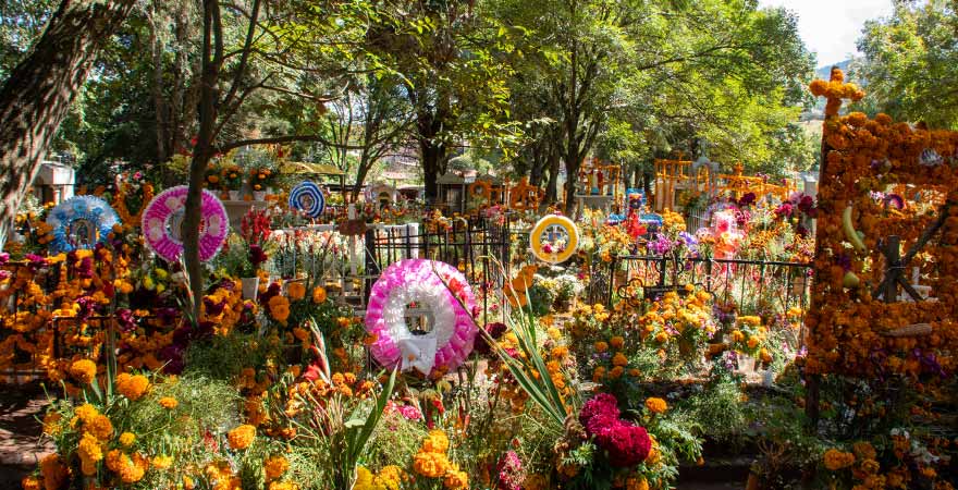 Fröhliche Umzüge, bunte Kostüme und ein farbenfrohes Blumenmeer: Nicht unbedingt das, was unsereins mit dem Gedenken an Verstorbene verbindet, – doch genauso wird der Día de los Muertos am 2. November in Mexiko zelebriert. Bereits Mitte Oktober beginnen die Vorbereitungen, um die toten Angehörigen, die an diesem Tag aus dem Jenseits zurückkehren sollen, angemessen zu begrüßen. Pappmaché-Skelette hängen an den Fenstern, die Menschen ziehen tanzend mit bunten Totenmasken durch die Straßen und die berühmte Skelett-Dame Calavera Catrina ist allgegenwärtig. Auf den Friedhöfen werden euch die prächtig geschmückten Altäre „Ofrendas“ auffallen: Die gelborangen Cempasúchil-Blumen sollen mit ihrer Farbe und dem Duft den Verstorbenen den Weg weisen, Kerzen und Musik liefern die passende Stimmung und das Lieblingsgericht des Toten sowie das süße Pan de Muertos und Totenschädel aus Zucker sorgen für Stärkung.