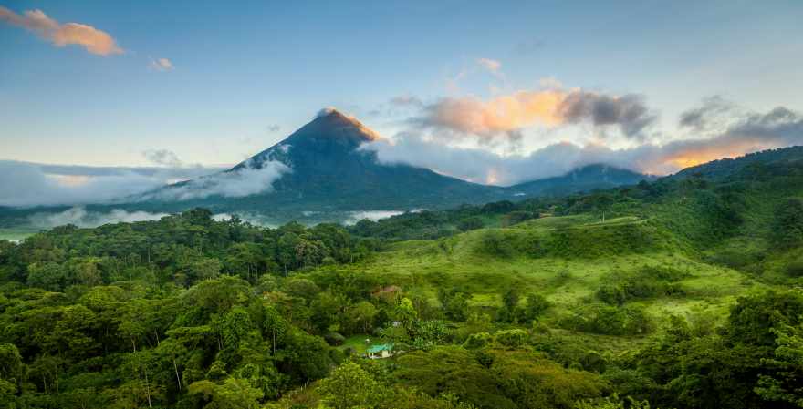 Malerischer Blick auf den Vulkan Arenal im Zentrum von Costa Rica bei Sonnenaufgang