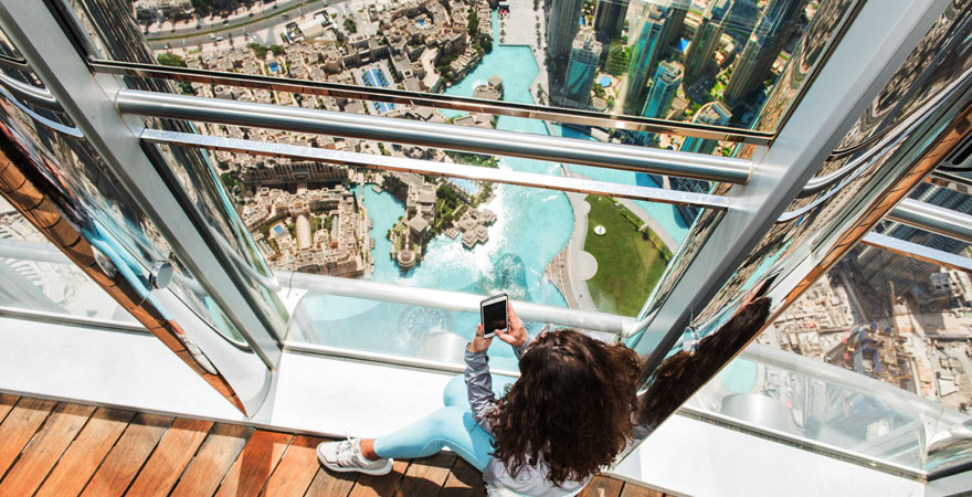 Der Turm ist ein Gebäude der Superlative: Es ist mit seinen 829,8 Metern Höhe nicht nur das höchste Gebäude der Welt, sondern besitzt auch die meisten Stockwerke, das höchste nutzbare Stockwerk und die am weitesten vom Boden entfernte Toilette der Welt. Aber keiner dieser Rekord beschreibt im Ansatz das Erlebnis, das man dort oben hat. Die Aussicht ist einfach nur atemberaubend, vor allem, weil man sieht, dass die Megametropole innerhalb nur weniger Jahre mitten in die Wüste gebaut wurde. Von dort oben sieht man nämlich nichts außer Sand, Wüste und flirrender Hitze, die die glitzernden und riesigen Neubauten der Stadt umrahmen. Durch die riesigen Glasscheiben und den 360 Grad Panorama-Blick hat man auch von Innen eine fantastische Aussicht. Wer sich das Spektakel gerne im Freien anschauen möchte, kann das allerdings ebenfalls auf einer Aussichtsplattform tun.