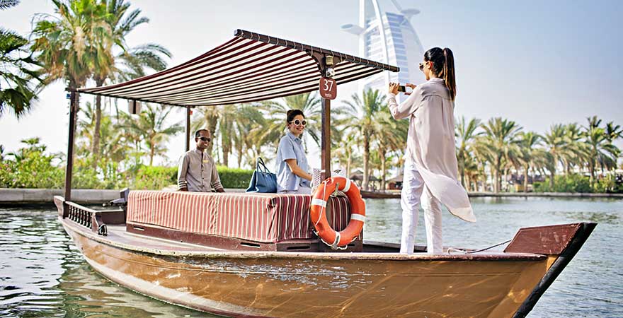 Der Dubai Creek ist eine rege genutzte Wasserstraße, in der alte Dhows, Fähren und andere Schiffe dümpeln, auf Schwimmen solltet ihr daher verzichten. Allerdings lohnt es sich, den Fluss mit einem der kleinen Holzboote zu überqueren und Dubai aus einer ganz neuen Perspektive zu entdecken. Per Fähre gelangt ihr zum Beispiel auch nach Deira, das für seine traditionellen Souks beliebt ist.