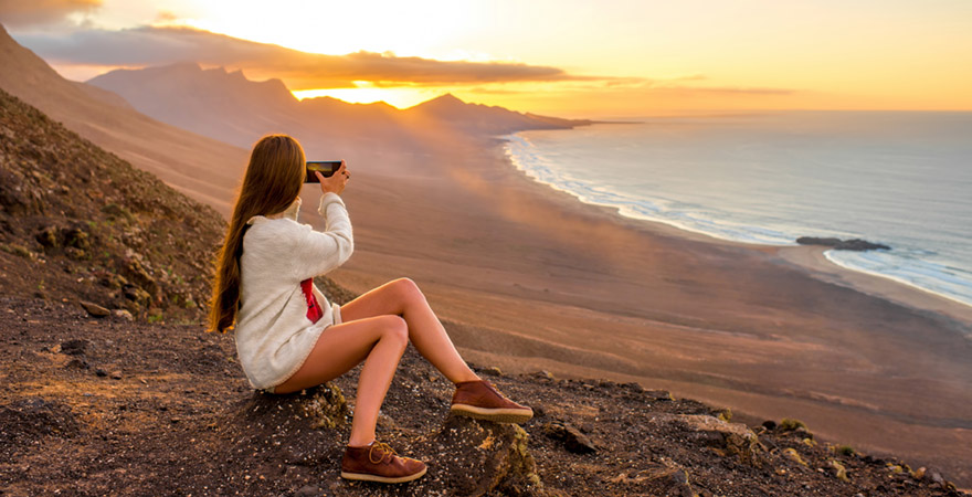 Young woman photographing with smart phone beautiful landscape with beach and mountains on the sunset on Fuerteventura island in Spain