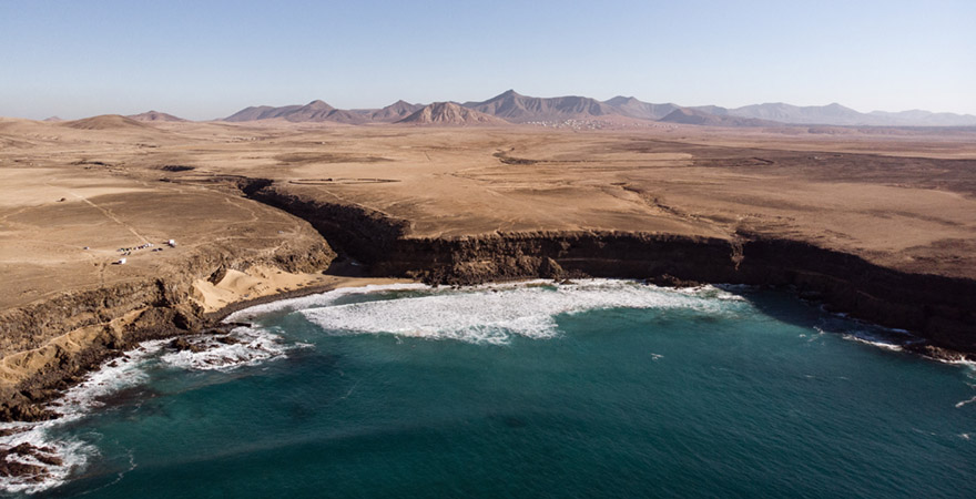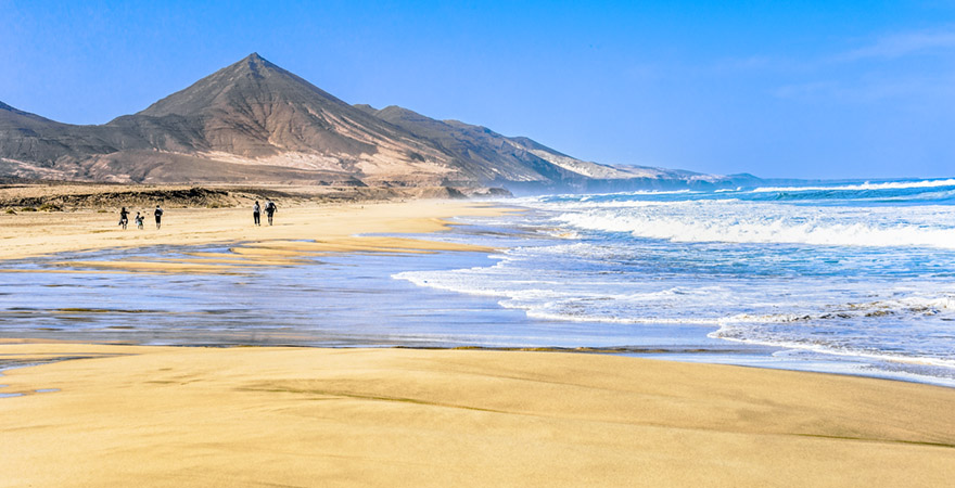 Fuerteventura ist die Insel der traumhaften Küsten und ist dabei so ursprünglich und wild wie kaum eine andere. Der Playa de Cofete, am nördlichen Zipfel der Halbinsel Jandía gelegen, ist ein weiteres Kleinod, das sich seinen Platz unter den schönsten Stränden Fuerteventuras redlich verdient hat. Strahlend hell ergießt sich feiner Sand auf einer Länge von etwa 12 Kilometern in die Wellen des Atlantiks. Das Stück Paradies ist fast komplett naturbelassen, für die Anfahrt empfiehlt sich ein geländegängiger Wagen, da ihr Playa de Cofete über eine unbefestigte Piste erreicht. Doch das Abenteuer wird mit einem atemberaubenden Panorama auf die Berge von Jandía, Kap El Islote und natürlich den Ozean belohnt. Zwar könnt ihr hier baden, doch aufgrund der oft hohen Wellen und Strömungen solltet ihr nah am Ufer bleiben. Dafür verheißt schon die salzige Brandung eine wunderbare Abkühlung.