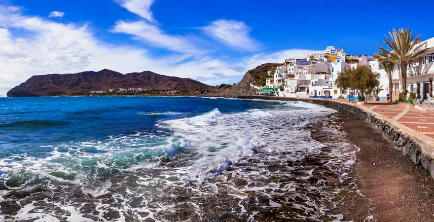 Idyllisch ziehen sich die weiß-blau-rot getünchten Häuser des Fischerortes Las Playitas den Hügel hinter der Strandpromenade hinauf. Rundum entschleunigt geht es hier zu, die kleine Promenade lädt zu einem kleinen Spaziergang ein und in den Restaurants genießt ihr feinen, fangfrischen Fisch. Der ortseigene Strand, der sich halbmondförmig an die Küste schmiegt, besticht mit seinem dunklen Vulkansand. Badeschuhe sind hier sehr empfehlenswert, da sich der teils feinsandige, teils kieselige Strand sehr schnell aufheizt. Gemütlich ist es in Las Playitas allemal, doch langweilig wird euch hier sicher nicht: Wie fast überall an Stränden von Fuerteventura könnt ihr nicht nur baden, sondern auch exzellent windsurfen. Für einen kleinen Ausflug bietet sich der Leuchtturm Faro de La Entallada an, von dem sich eine wunderschöne Sicht auf den Atlantik und die Berglandschaft von Cuchillos de Vigán eröffnet.