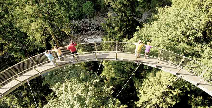 • Capilano Suspension Bridge Park: Rund 20 Minuten nördlich von Vancouver gelegener Park, der sich um eine tiefe Schlucht erstreckt und besonders für seine frei schwingende Hängebrücke umgeben von dichtem Dschungelgrün bekannt ist