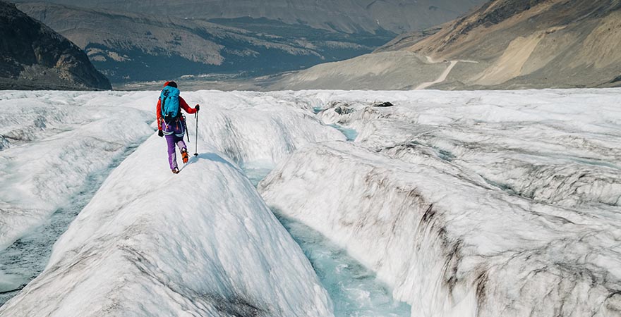 Wer sich an der Grenze zwischen dem Jasper- und dem Banff-Nationalpark umblickt, sieht sich einer riesigen Fläche aus in den wunderschönsten Tönen schimmerndem Eis umgeben. Denn hier erstreckt sich das insgesamt über 325 Quadratkilometer große Columbia-Eisfeld – eine der größten Eisansammlungen südlich des Polarkreises mit insgesamt acht Gletschern.