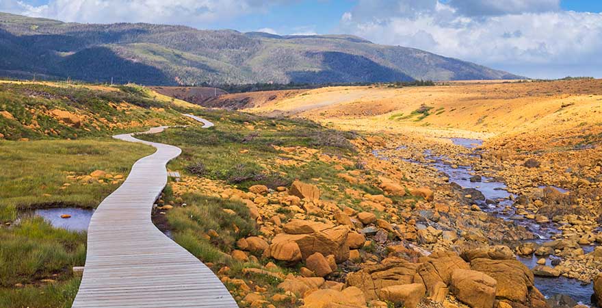 Steg durch die Landschaft der Tablelands mit gelben Steinbrocken im Gros Morne Nationalpark in Kanada