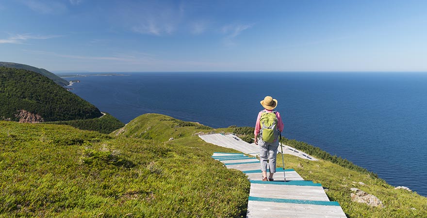 Wanderer auf dem Cabot Trail auf Cape Breton Island mit der Aussicht auf das Meer