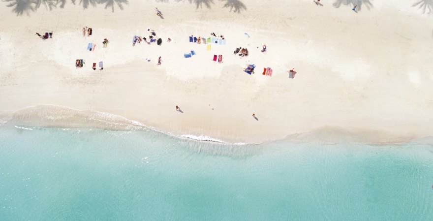 Strandabschnitt in Koh Phangan von Oben mit vielen kleinen Strandbesuchern auf Badetüchern