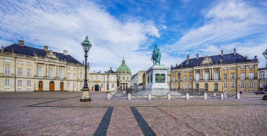 Angesichts des liberal-progressiven dänischen Staatswesens ist es etwas überraschend, dass in unserem nördlichen Nachbarland die älteste Monarchie Europas zu Hause ist. Obwohl die Königsfamilie heutzutage (ähnlich wie im Vereinigten Königreich) hauptsächlich traditionell-repräsentativ in Erscheinung tritt, hat sie im Laufe ihrer Geschichte in ganz Dänemark in Form von Prachtbauten ihre Spuren hinterlassen. In Kopenhagen ist das zentral gelegene Schloss Amalienborg das wohl eindrucksvollste „royale Juwel“. Streng genommen ist der Name etwas verwirrend, denn es handelt sich weniger um ein Schloss, als vielmehr um einen Palastkomplex.