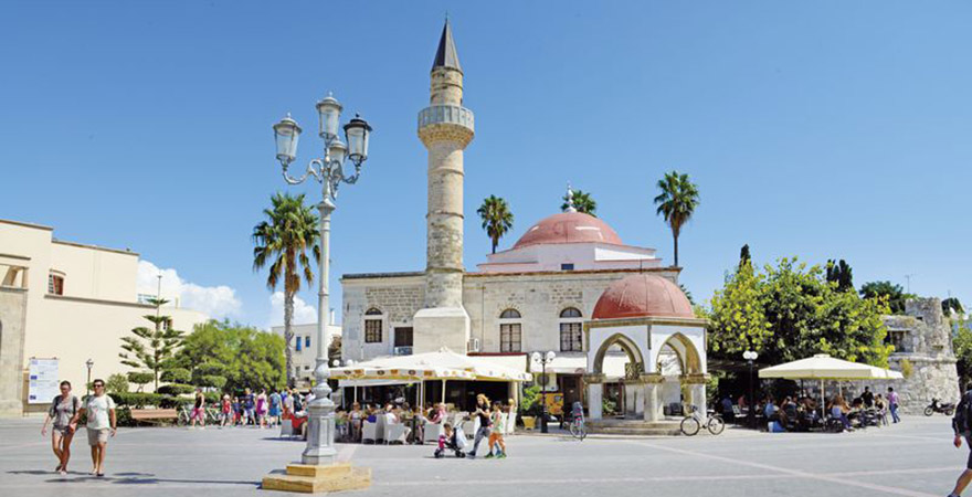 Die Hauptstadt und das kulturelle Zentrum der griechischen Insel ist Kos Stadt, die am nordöstlichen Ende der Insel liegt. Am Freiheitsplatz „Platía Eleftherías“ taucht ihr in das geschäftige Geschehen der Stadt ein. Wenn ihr euch dort umseht, fällt euch die Basilika Agía Paraskeví ins Auge, die über dem Platz thront. Byzantinische Malereien schmücken das Innere der Bischofskirche aus dem frühen 20. Jahrhundert, die leider durch das Erdbeben im Jahr 2017 starke Schäden davongetragen hat. Hier werdet ihr zum ersten Mal merken, dass die Kultur und Architektur von Kos durch verschiedenste historische Epochen geprägt wurde, in deren Verlauf es zu wechselnden Besetzungen durch mediterrane Großmächte kam: Schräg gegenüber der orthodoxen Basilika nämlich befindet sich die Defterdar-Moschee, deren schlankes Minarett weithin sichtbar über den Platz hinausragt. Die 1725 unter osmanischer Herrschaft erbaute islamische Gebetsstätte wird heutzutage allerdings nicht mehr als solche genutzt.