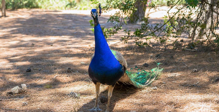 Auf dem Weg zum westlichen Teil der Insel könnt ihr für eine Auszeit im Grünen einen Zwischenstopp beim Plaka-Wald einlegen, der sich unweit des Flughafens befindet. Der herrliche Pinienwald mit idyllischen Flüsschen und Teichen lädt zu einem ausgiebigen Spaziergang ein, bei dem ihr einmal so richtig durchatmen könnt. Bringt gerne eure Verpflegung mit, denn im Wald stehen euch Picknick- und Grillplätze zur Verfügung. Bestimmt begegnet ihr auch der ein oder anderen Katze, die im Wald zuhause ist. Das Highlight des Plaka-Waldes aber sind die vielen Pfaue, die hier frei umherlaufen. Wenn die männlichen Tiere zum Beeindrucken der Weibchen ihr prächtiges Federkleid präsentieren, kommen große und kleine Besucher ins Staunen. Vergesst nicht, für ein paar tolle Schnappschüsse eure Kamera bereitzuhalten!