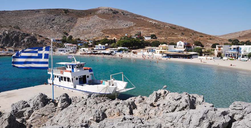 Die Nachbarinsel von Kos präsentiert sich ganz anders als Kos. Karge Felswände dominieren das Bild. Trotz der unwirtlichen Bedingungen sind die Menschen auf der Insel recht wohlhabend. Der Reichtum kam früher von den Tauchern, die die begehrten Schwämme aus dem Meer fischten. Heute werden hier aber eher Schwert- und Thunfische geangelt.
