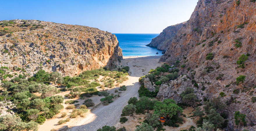 Wir begeben uns an die Südküste Kretas, wo etwa 80 Kilometer südlich von Heraklion am Ende der Agiofaraggo-Schlucht eine idyllische Bucht liegt. Der Strand zieht vor allem Naturliebhaber und Wanderer an, denn um ihn zu erreichen müsst ihr zuerst einmal die sogenannte „heilige Schlucht“ durchwandern. Der Weg gestaltet sich spektakulär: zwischen imposanten Felsklippen hindurch, vorbei an Höhlen, in denen einst Asketen lebten, und der Kapelle des Heiligen Antonius. Die Wanderung ist nicht sehr schwer und auch mit Kindern zu bewältigen, jedoch wird festes Schuhwerk empfohlen. Nach circa 30 Minuten erreicht ihr den Kiesstrand, der nach außen versteckt in der Bucht liegt. Durch den Schutz der Felsen ist das Wasser ruhig, der Einstieg jedoch recht steinig.