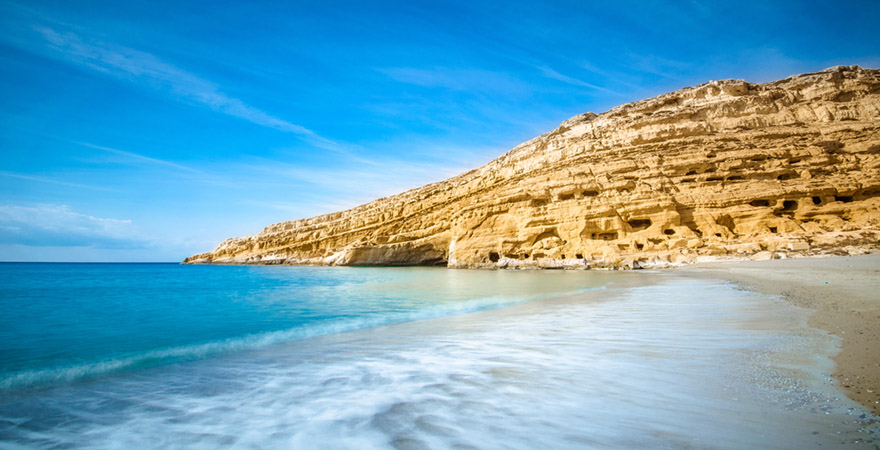Der Strand von Matala selbst ist berühmt für seine Hippie-Höhlen, die sich im Norden in den Felshang schmiegen. In den 1960er und 1970er Jahren befand sich hier Kretas Hippie-Treffpunkt schlechthin, was sich bis heute unschwer an den kreativen Wandmalereien und kunterbunt gestalteten Geschäften im Ort erkennen lässt. Die Höhlenwohnungen, die den Hippies einst als Unterschlupf dienten, stammen vermutlich bereits aus der Antike und sind mittlerweile durch eine Umzäunung vor dem Andrang der Neugierigen geschützt.