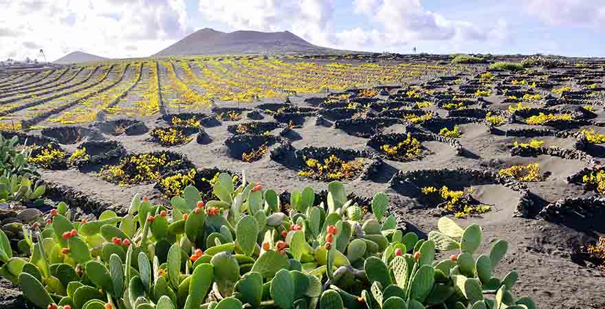 Den optimalen Blick auf das Weingebiet in den Hügeln bei Puerto del Carmen habt ihr auf der Straße von Uga nach Monumento al Campensino. Aufgrund des trockenen Klimas wird der Wein auf Lanzarote mithilfe eines einfachen, doch genialen Systems angebaut: Die Weinstöcke werden in tiefe Löcher im dunklen Vulkankies vergraben und von halbkreisförmigen Mauern vor zu starkem Wind geschützt. Das leuchtende Grün der in perfekten Reihen gepflanzten Reben ergibt zusammen mit dem Ocker und Schwarz der Landschaft ein einzigartiges, fotogenes Naturerlebnis.