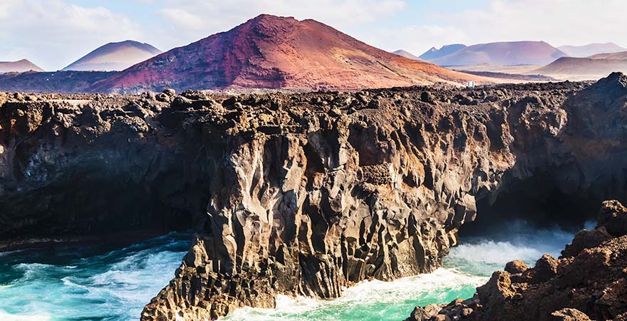 [otw_shortcode_info_box border_type=“bordered“ border_color_class=“otw-orange-border“ border_style=“bordered“]Tipp: Die Lagune Charco de los Clicos, die sich im versunkenen Vulkankrater bildete, ist auf unterirdischem Weg mit dem Meer verbunden, sodass ständig frisches Wasser hereinfließt. Doch ist der Salzgehalt hier höher als im Meer, weshalb sich eine spezielle Algenart entwickeln konnte, die den Kratersee in einem geheimnisvollen Grün schimmern lässt. Das Farbspiel zwischen dem schwarzen Lavasand und dem Grün ist faszinierend.[/otw_shortcode_info_box] [otw_shortcode_info_box border_type=“bordered“ border_color_class=“otw-orange-border“ border_style=“bordered“]Hoteltipp: Das Hotel The Mirador Papagayo befindet sich im beliebten Urlaubsort Playa Blanca mit seinen wundervollen Stränden und liegt ideal für einen spontanen Ausflug nach El Golfo.[/otw_shortcode_info_box]6. Los Hervideros: Wo Lava und Meer spektakuläre Höhlen schufen